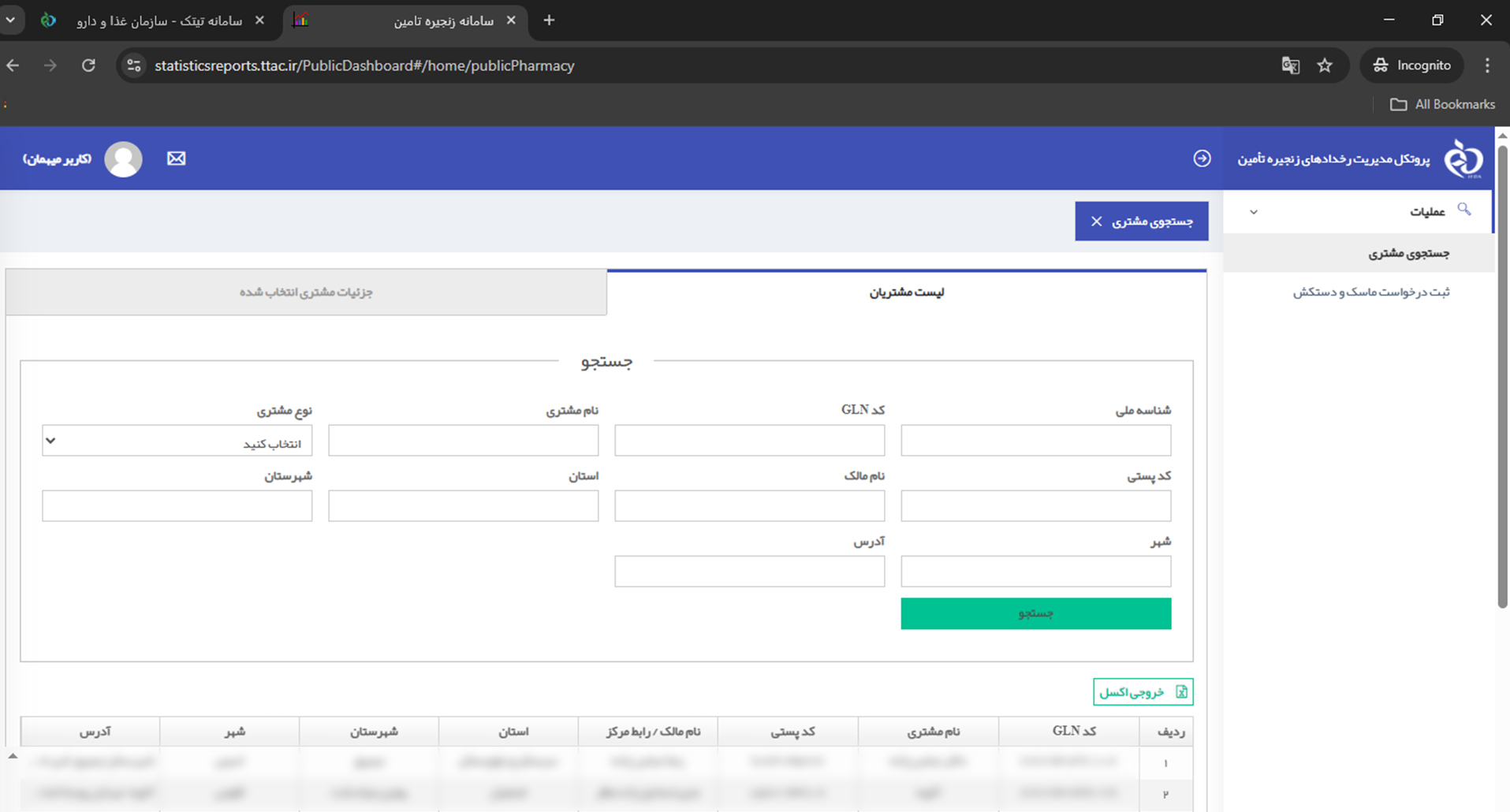 سپس روی دکمه‌ی جستجو کلیک کنید تا فهرست داروخانه‌های مرتبط نمایش داده شود.